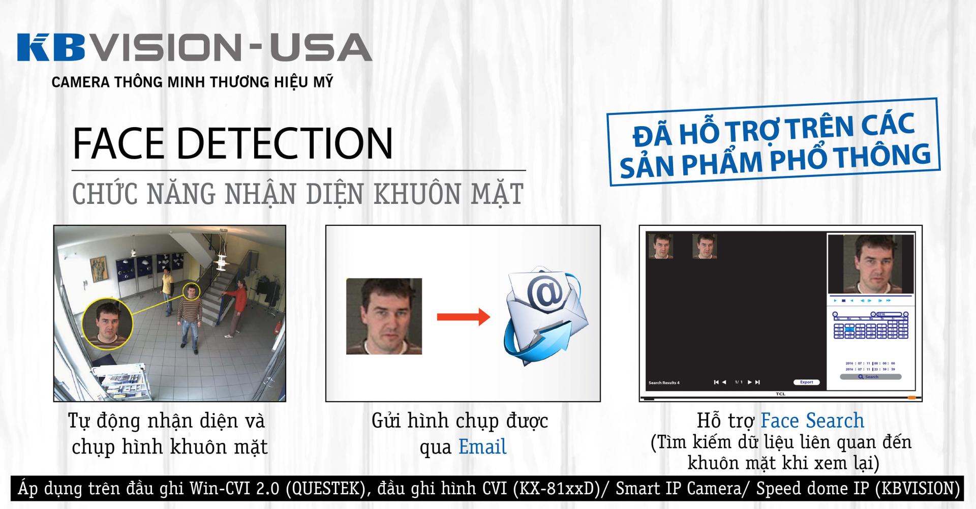 Nhận diện khuôn mặt (Face Detection). Camera tự động chụp hình khuôn mặt của người đang vào khu vực mà camera quan sát thấy và lưu lại các khuôn mặt vào ổ cứng, rất thích hợp để ghi nhận tất cả người ra vào giới hạn